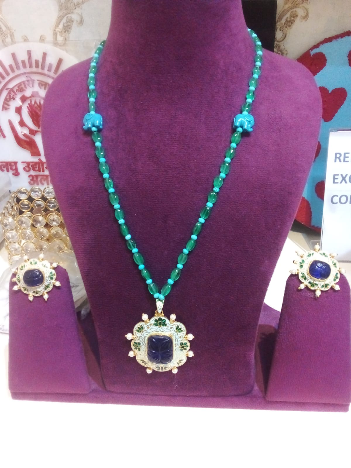 Experience the charm of traditional craftsmanship with this exquisite jewellery set crafted in premium 925 silver with gold plating. The centerpiece features a beautifully carved blue stone, complemented by intricate Rajasthani Meenakari work that adds depth and royal vibrance. Perfectly coordinated earrings elevate the look, making this set an ideal choice for festive occasions, weddings, and timeless celebrations. Lightweight yet luxurious, it blends heritage artistry with contemporary elegance.