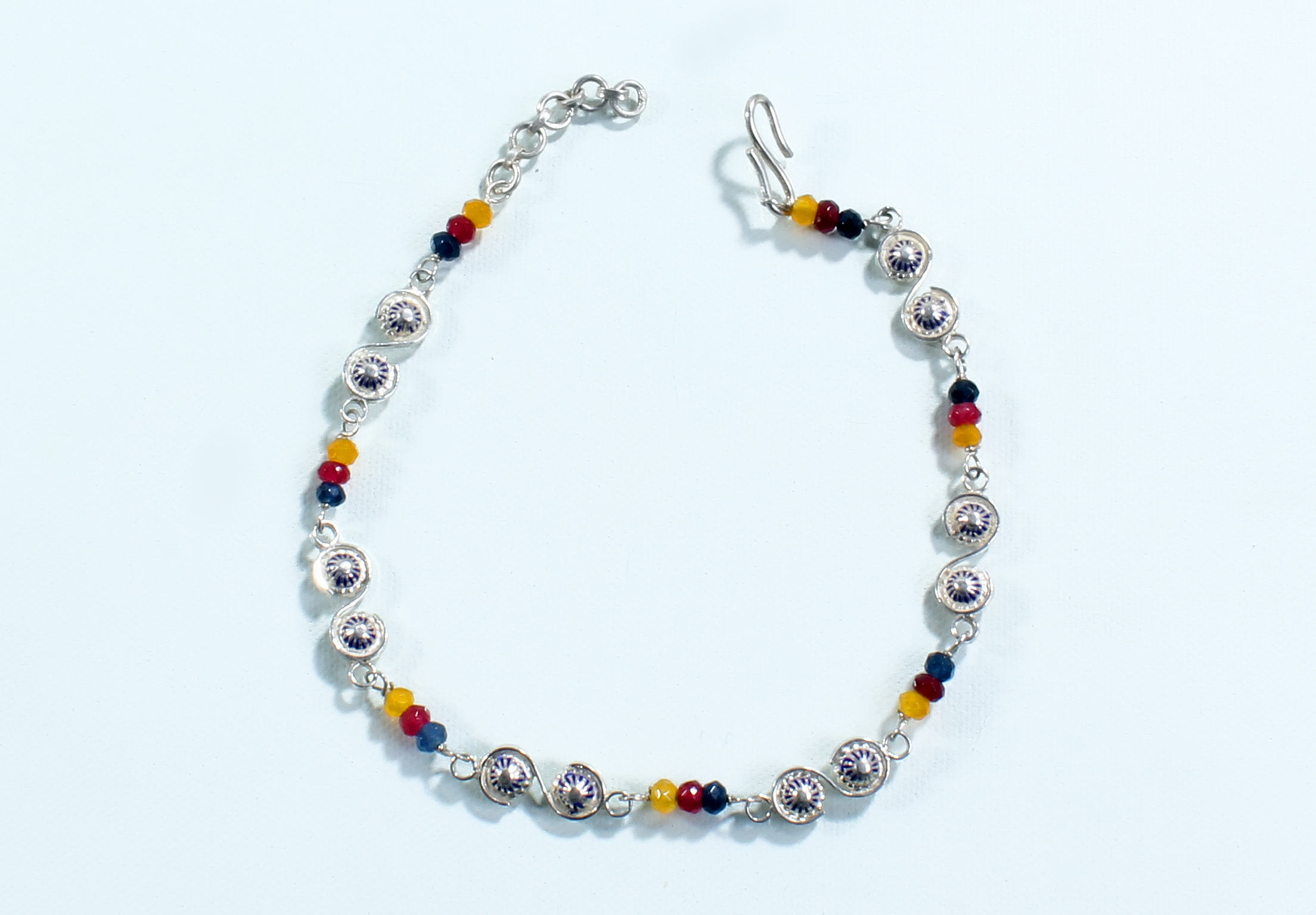 Silver’s gleam with beads aglow, A rainbow dance in every row. Around the ankle,                                                                                                                  colors align, In every step, a vibrant sign.