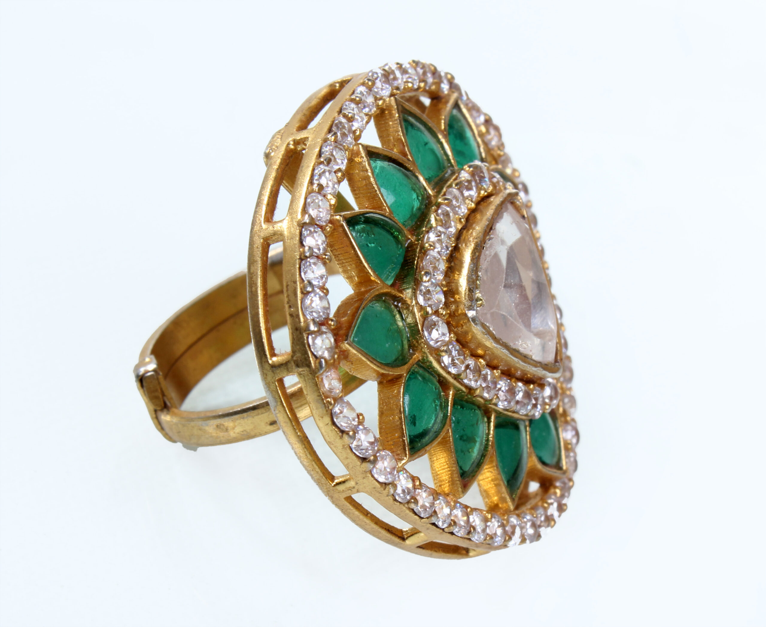 Amidst the rolling hills and golden meadows of a distant land, lies a hidden oasis of beauty and grace. Inspired by the enchanting allure of nature’s bounty, the Golden Meadows Kundan Zircon Ring captures the essence of this idyllic landscape, inviting you to embark on a journey where dreams and reality intertwine in a timeless dance of elegance and charm.