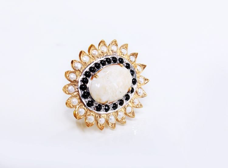 Introducing our Midnight Opal Pearl Statement Ring, a bold and breathtaking piece that commands attention. Crafted with precision from lustrous black onyx, mesmerizing opal, and elegant pearls, this ring exudes sophistication and glamour. The dramatic contrast of the deep black onyx against the iridescent opal and luminous pearls creates a striking visual impact, making it the perfect accessory for any occasion. Elevate your style and make a statement with the Midnight Opal Pearl Statement Ring from Astitva Jewels.