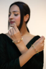 Celebrate the beauty of unity with the Harmony of Hues Dual Bangle. Each intertwined bangle symbolizes the seamless blend of tradition and modernity, adding a touch of vibrant elegance to your every gesture.