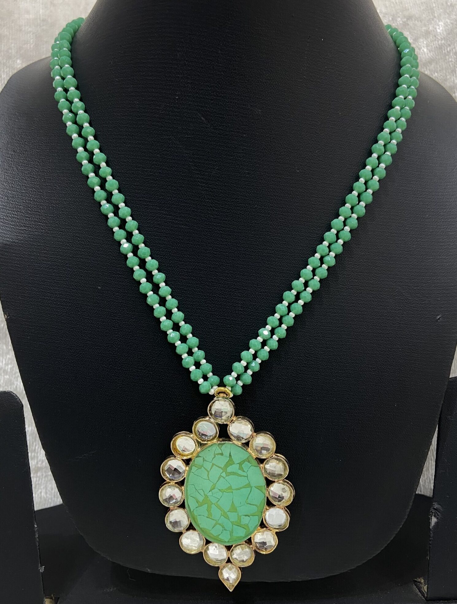 This exquisite pendant features a stunning combination of silver with gold polish, intricate kundan work, and vibrant green enamel. It is adorned with green beads and small white beads, creating a perfect blend of elegance and tradition.