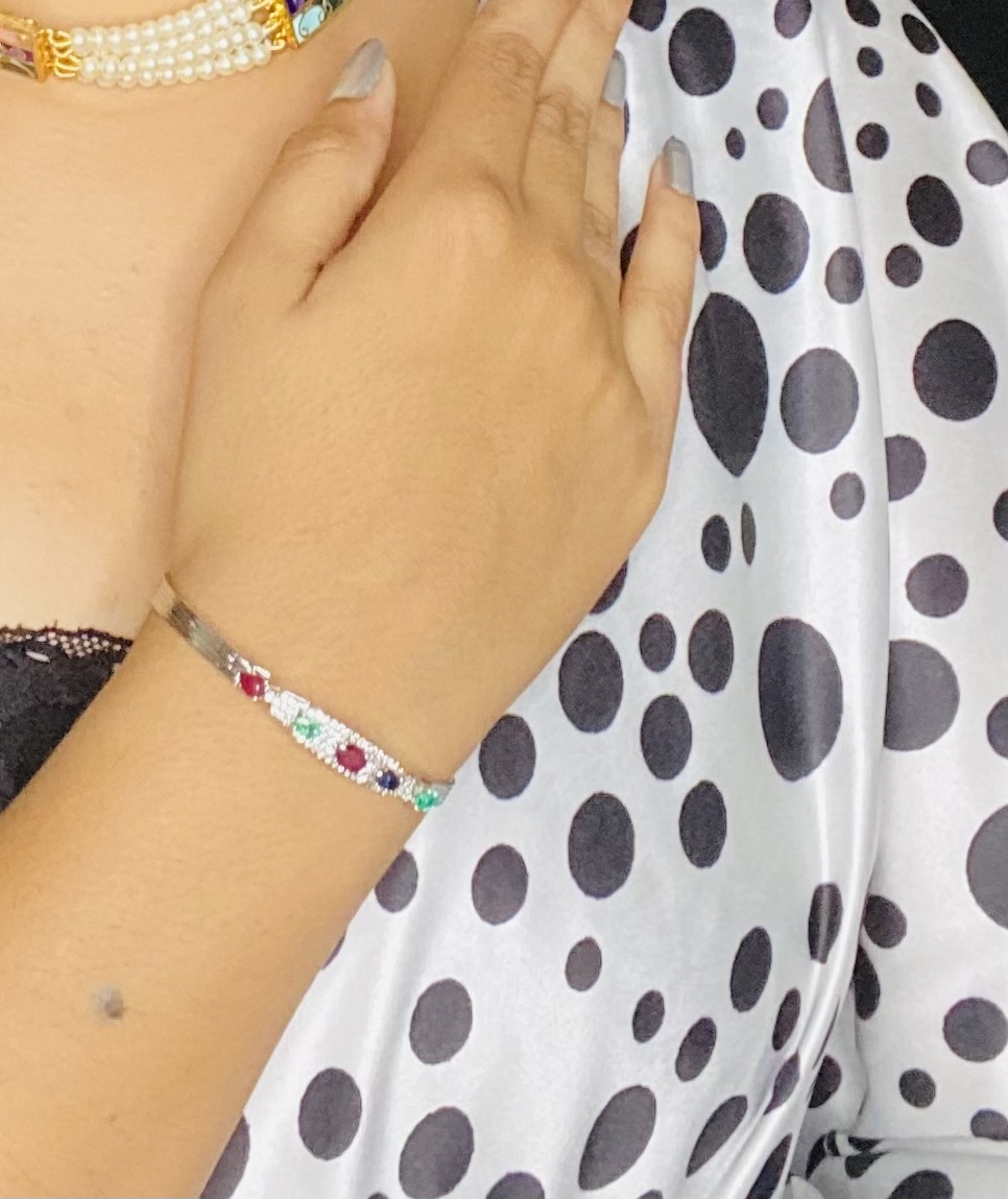 Introducing the Majestic Trio Ruby, Panna, and Blue Sapphire Adjustable Bracelet by Astitva Jewels, an exquisite piece that showcases a vibrant blend of precious gemstones and timeless elegance. This stunning bracelet features radiant rubies, lush panna (emeralds), and captivating blue sapphires, meticulously set in a high-quality sterling 925 silver base. The adjustable chain ensures a perfect fit for any wrist size, providing both comfort and versatility. The rich colors of the gemstones create a striking visual appeal, making this bracelet perfect for special occasions and everyday sophistication.