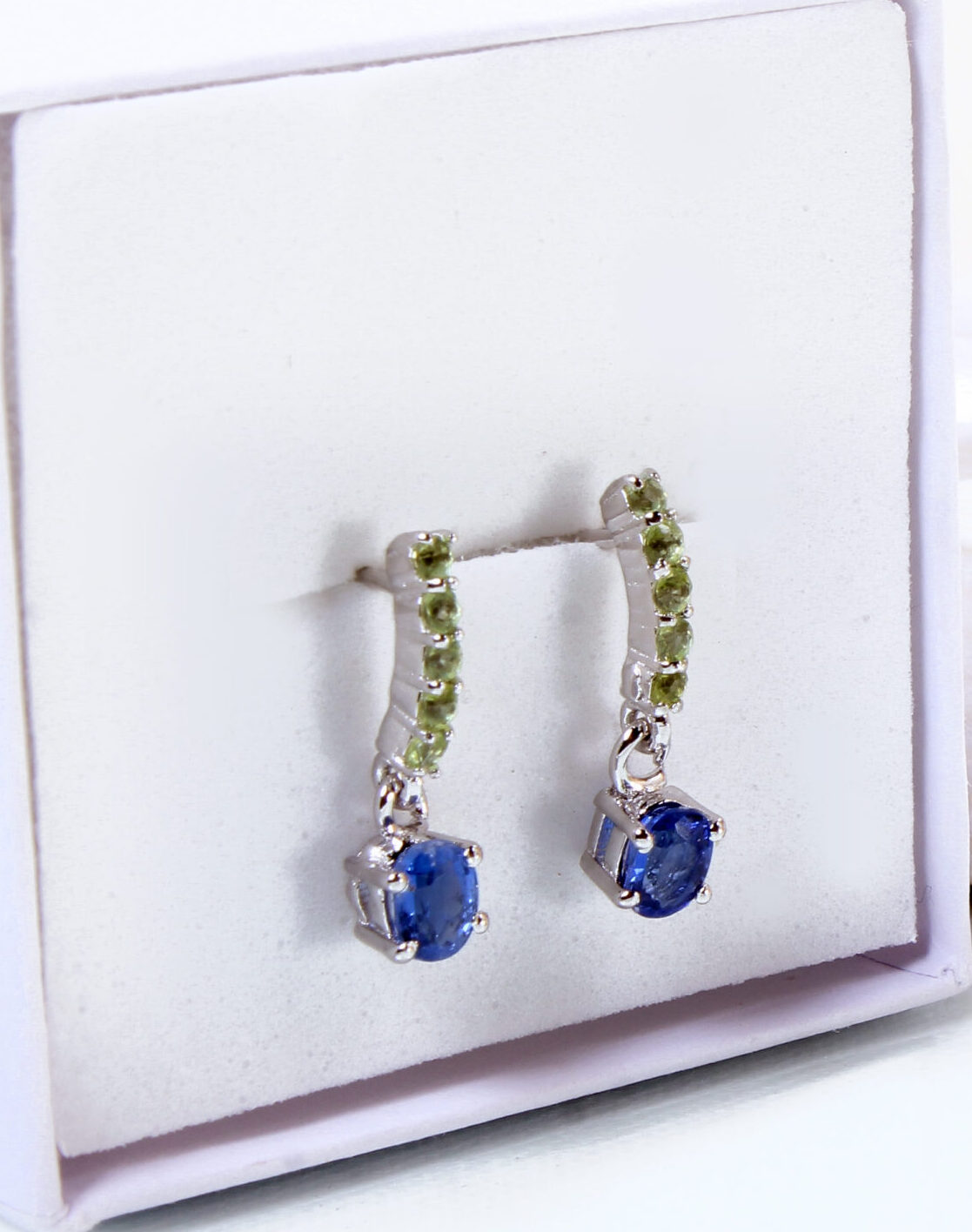 The Enchanted Peridot and Kyanite Earrings, crafted from sterling 925 silver, feature stunning green peridot and deep blue kyanite stones. These earrings blend vibrant colors and timeless design, making them a perfect addition to any jewelry collection.