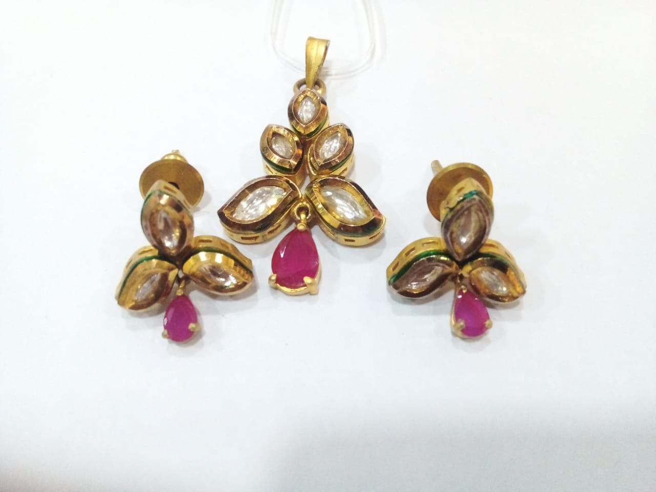 The Raktima Set by Astitva Jewels exudes regal elegance, handcrafted in 925 sterling silver with a rich gold-plated finish. Embellished with traditional kundan work and deep red stones, this Pendant and Earring Set reflects timeless beauty and royal charm. Perfect for weddings, festivals, or grand occasions, it adds a majestic touch to any ethnic ensemble.