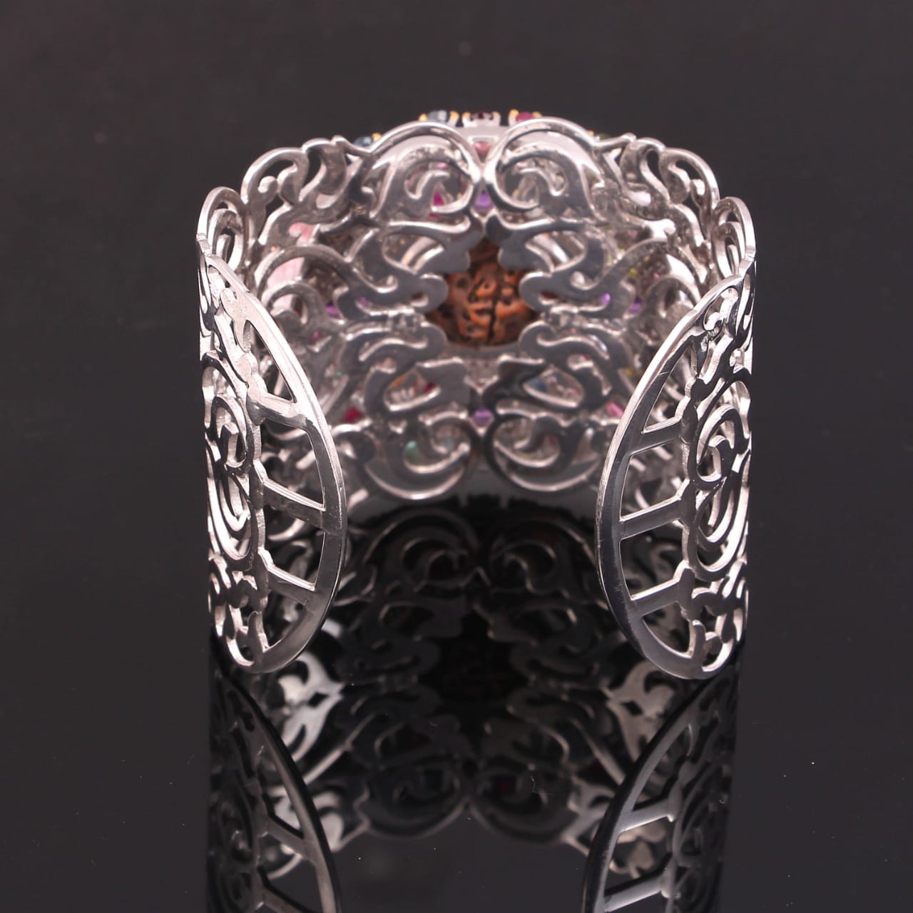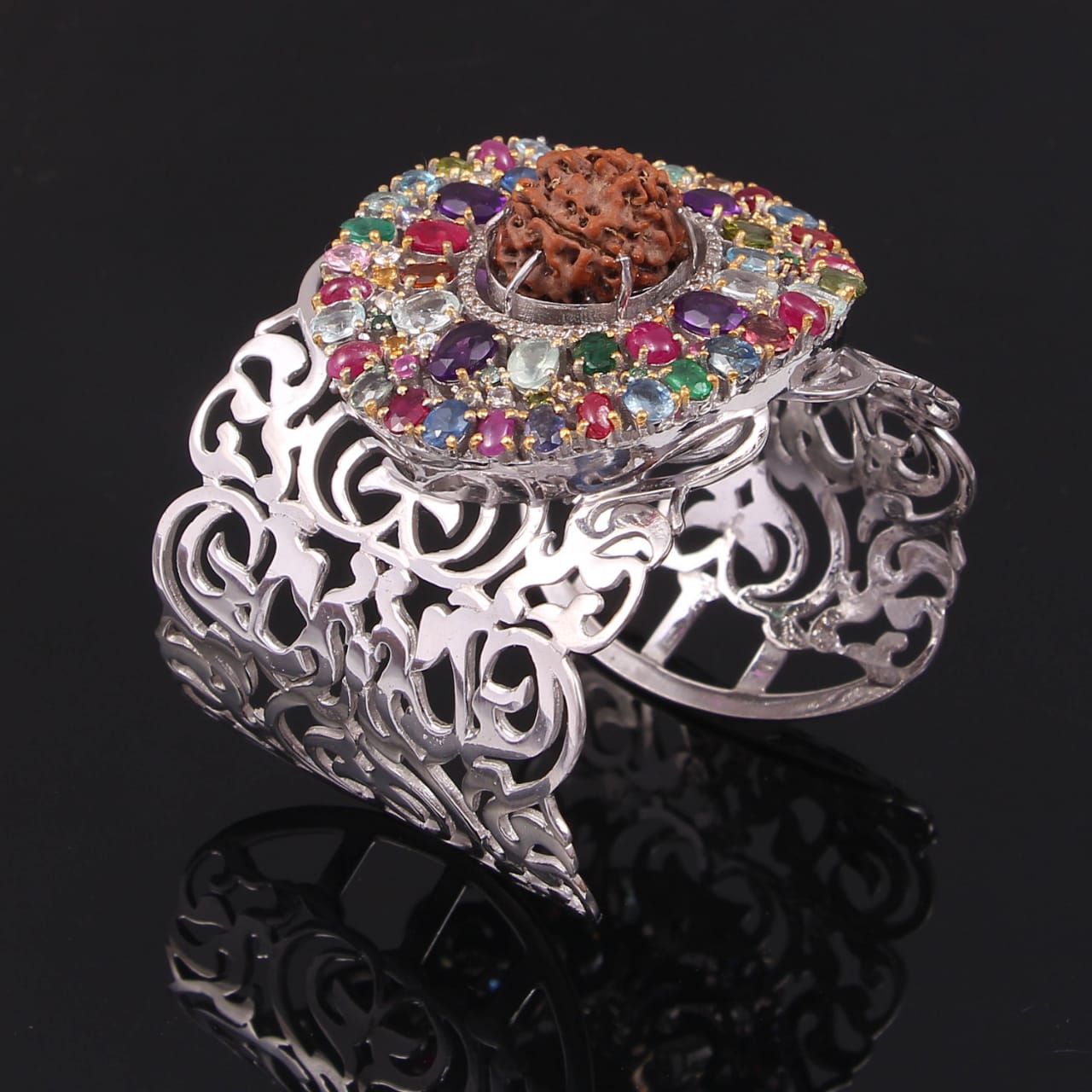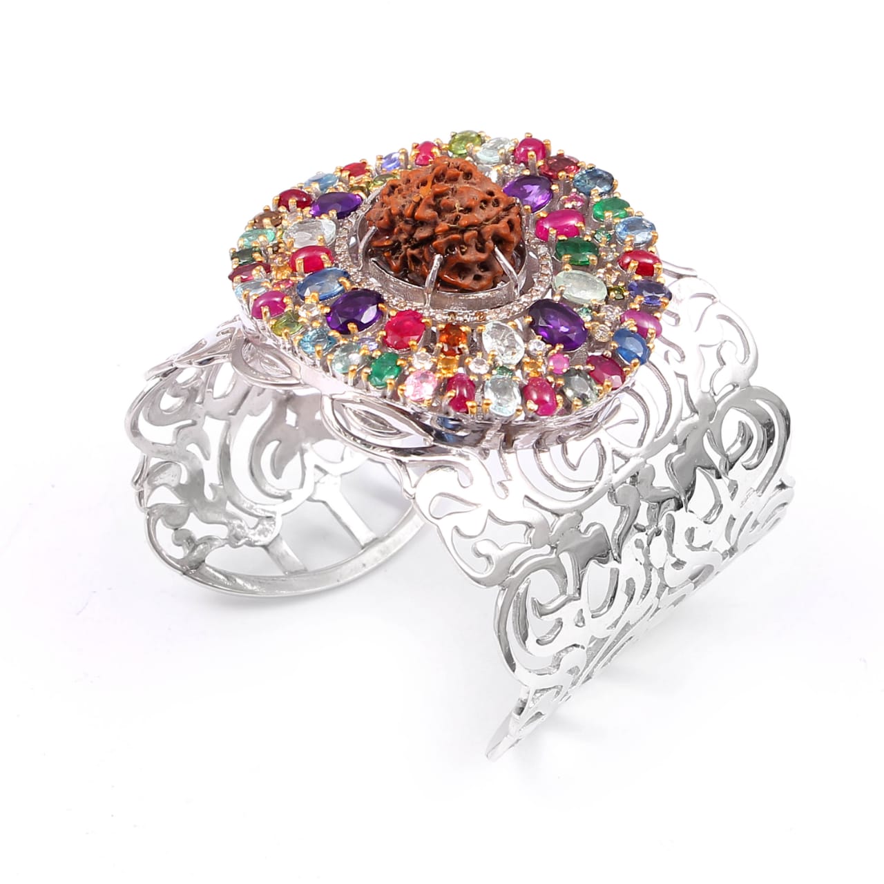 Indulge in unparalleled luxury with the Royal Rudraksha Precious Gemstone Bracelet. This exquisite broad bracelet combines the sacred rudraksha beads with an array of precious stones, including dazzling diamonds, vibrant blue topaz, and other gemstones. Crafted from high-quality materials, this bracelet is a masterpiece that embodies spiritual significance and opulent elegance, making it a standout piece in any jewelry collection.